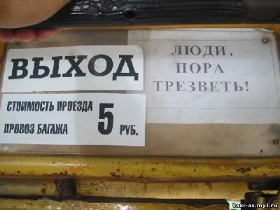 * На переднем сиденье ноги не раздвигать! * Уважаемые пассажиры, будьте бдительны, не забывайте в салоне оружие, наркотики и пакеты со взрывчаткой. * Ничто так не внушает доверия, как предоплата. * Мамаши, сажайте на руки 5-летних детей, а не 16-летних придурков! * Пешеход прав, пока жив. * За копейки ездят на "копейке". * Вежливый сдачи не попросит. * Дверь закрывать нежно, пальчиком! * Закурил? Дай закурить водителю! * За вопрос: "Когда поедем?" - червонец. * Интим без денег ПРЕДЛАГАТЬ! * Закрывая дверь, посмотри в глаза тому, кому прищемишь пальцы. * Водитель женат! Но... * Прижимаясь ближе к соседу, вы дарите надежду людям на остановке. * Просьба об остановке сообщать водителю, а не соседу.